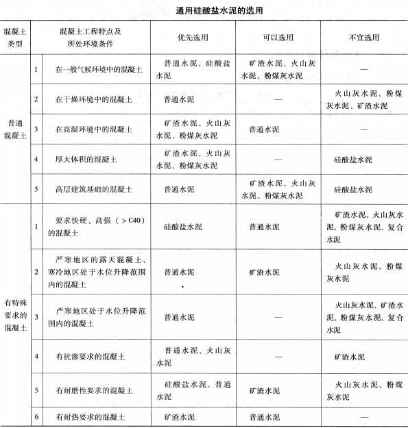 1、水泥品种选择,水泥品种选择应考虑工程特点、工程所处环境条件及施工条件,进行合理选择,可参照下表。
